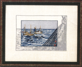 Broderikit af en gruppe båd ude og fiske i havet med de blå bølger