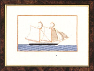 Broderikit med motiv at Skonnert fra 1800-tallet. Broderiet er af den store sejlbånd på åbent hav