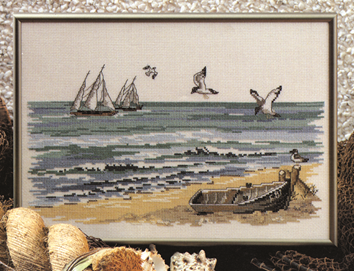 Broderikit med motiv af stranden og havet. Der flyver måger, og en lille robåd ligger i strandkanten. Ude i havet sejler 2 sejlbånde.